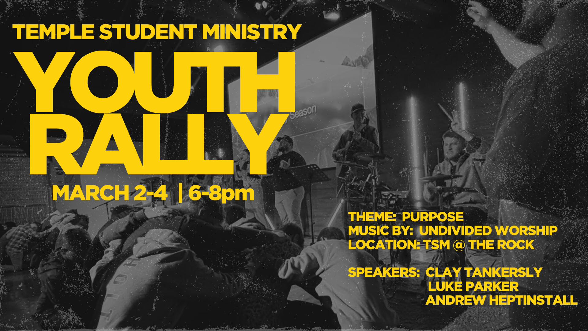 Youth Rally is a three-day event held at TSM from March 2–4, 2026. This event is designed for Middle School, High School, and College students, and we encourage our students to invite friends for night of worship and an inspiring message. It’s a time to gather, connect, and grow in faith together.